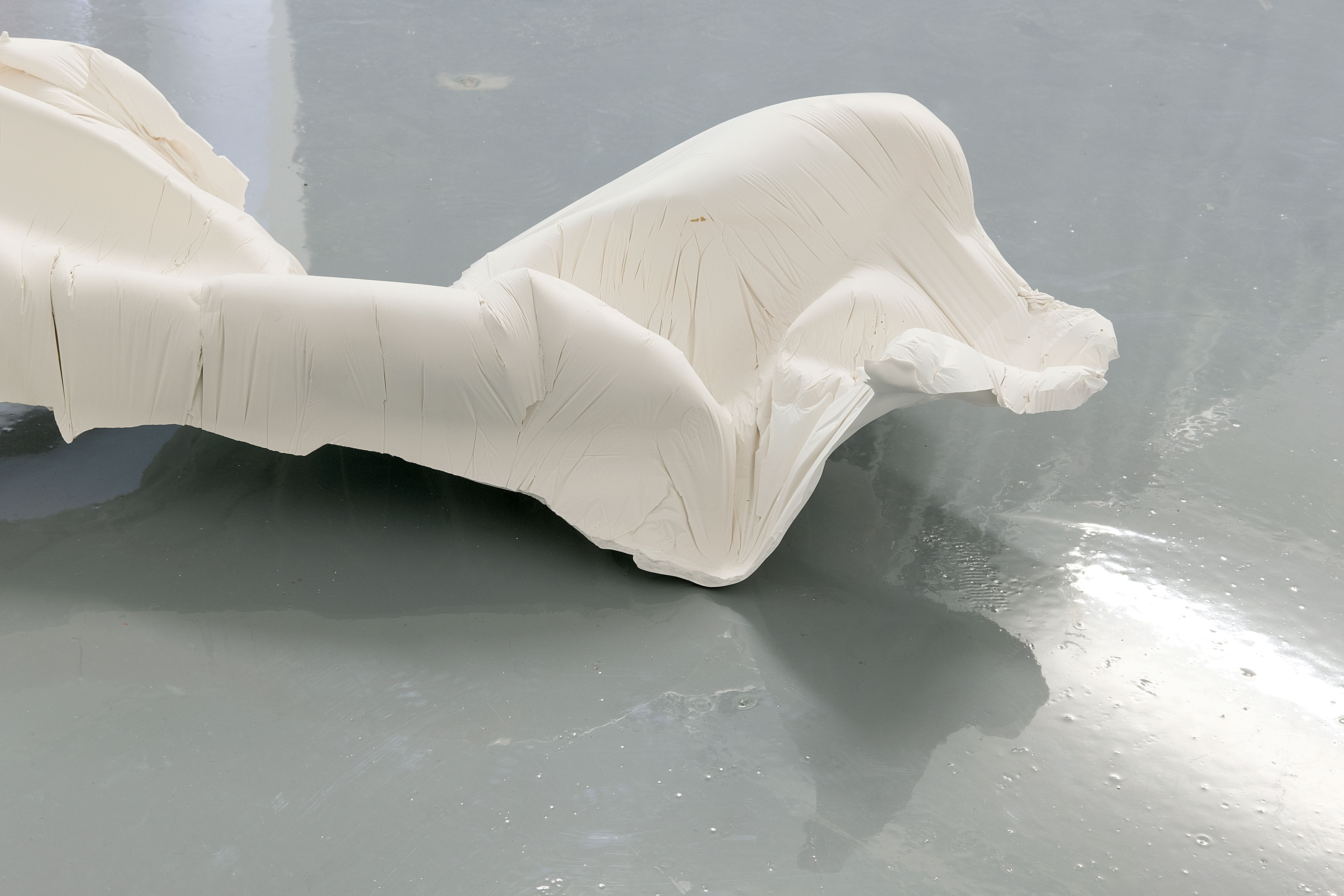Konvexe und konkave Wölbungen sind die bestimmenden plastischen Gesten der ausgestellten Skulpturen und stehen gleichzeitig symptomatisch für grundsätzliche Körperformen. Während die Arbeit Auf einem langen Schatten aus schwarzem Rindsleder besteht, das schlaff und ohne seine einstige Rolle als Hülle zu erfüllen von einem metallenen Rückgrat hängt, schmiegen sich in Über dem See und umgekehrt fragmentarische Abgüsse aus Acrylharz um längst entschwundene Körperteile: Eine zweifache Annäherung an jene Grenze also, wo Körper und Umgebung als Negativ des jeweils anderen zusammenfallen.